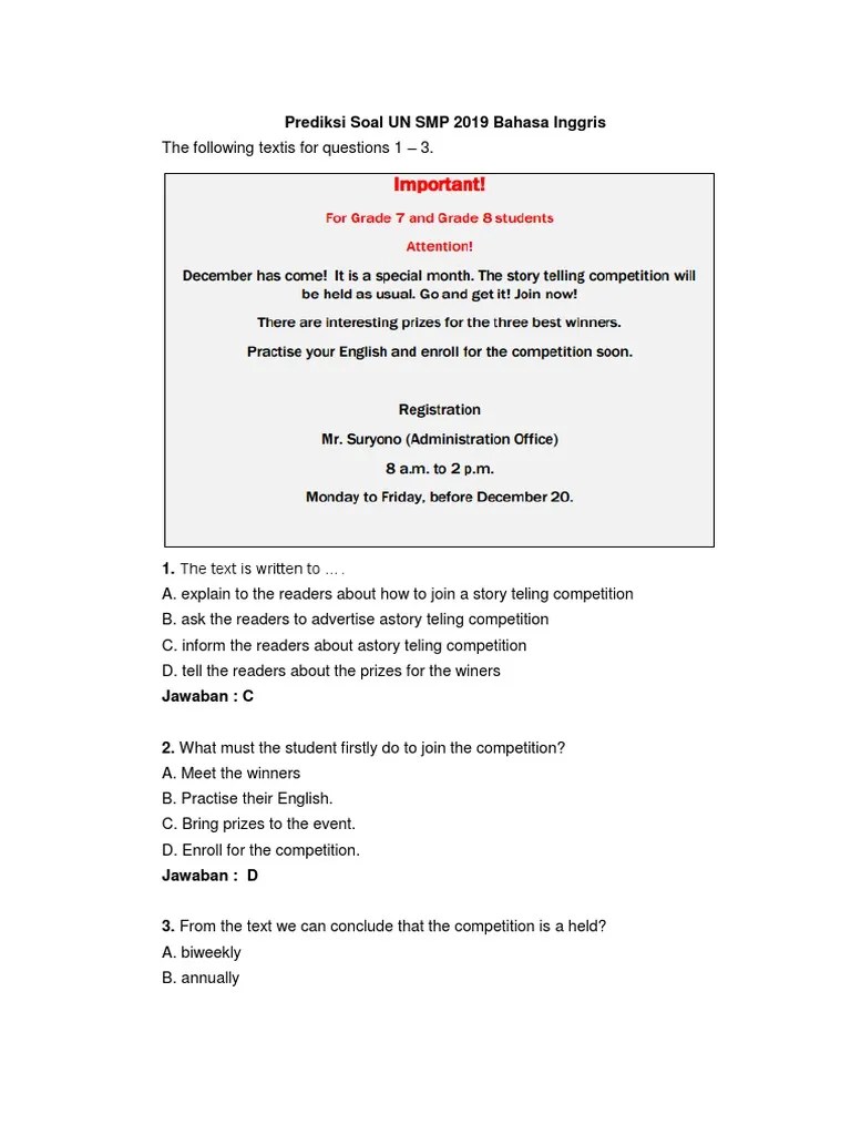 Kolom khusus contoh soal dan pembahasan disajikan dalam 3 level kognitif, . Inggris di tokopedia ∙ promo pengguna baru ∙ cicilan 0% ∙ kurir instan. Di dalam membantu peserta didik menghadapi un tahun pelajaran 2019/2020, berikut admin bagikan prediksi soal un bahasa inggris smp mts tahun 2020 paket 1. Ini cuma latihan online soal un (unbk) dan us bahasa inggris smp/mts tahun 2020 tahun pelajaran 2019/2020. 27 sep 2019 soal bahasa inggris kelas 7 smp semester 1 kunci jawaban 8211 bahasa inggris merupakan bahasa asing utama yang wajib dipelajari .